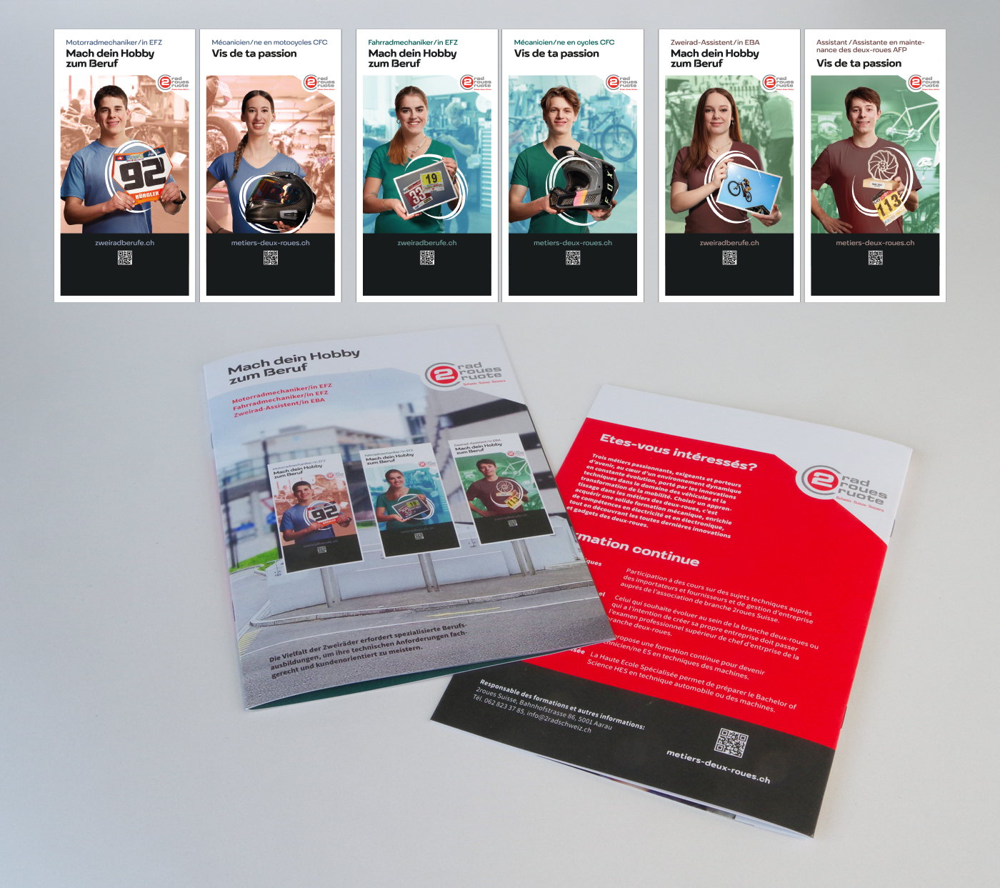 …haben wir jeweils zwei Lehrlings-Basissujets entwickelt. Die drei Berufe unterscheiden sich zudem farblich, wodurch die Farben gleichzeitig als Signalisationsmittel dienen. Die ersten Massnahmen umfassten zweisprachige Flyer für Berufsmessen. Weitere Einsatzmöglichkeiten der Sujets sind Standumsetzungen, beispielsweise auf grossen Lightboxen und Messewänden.
